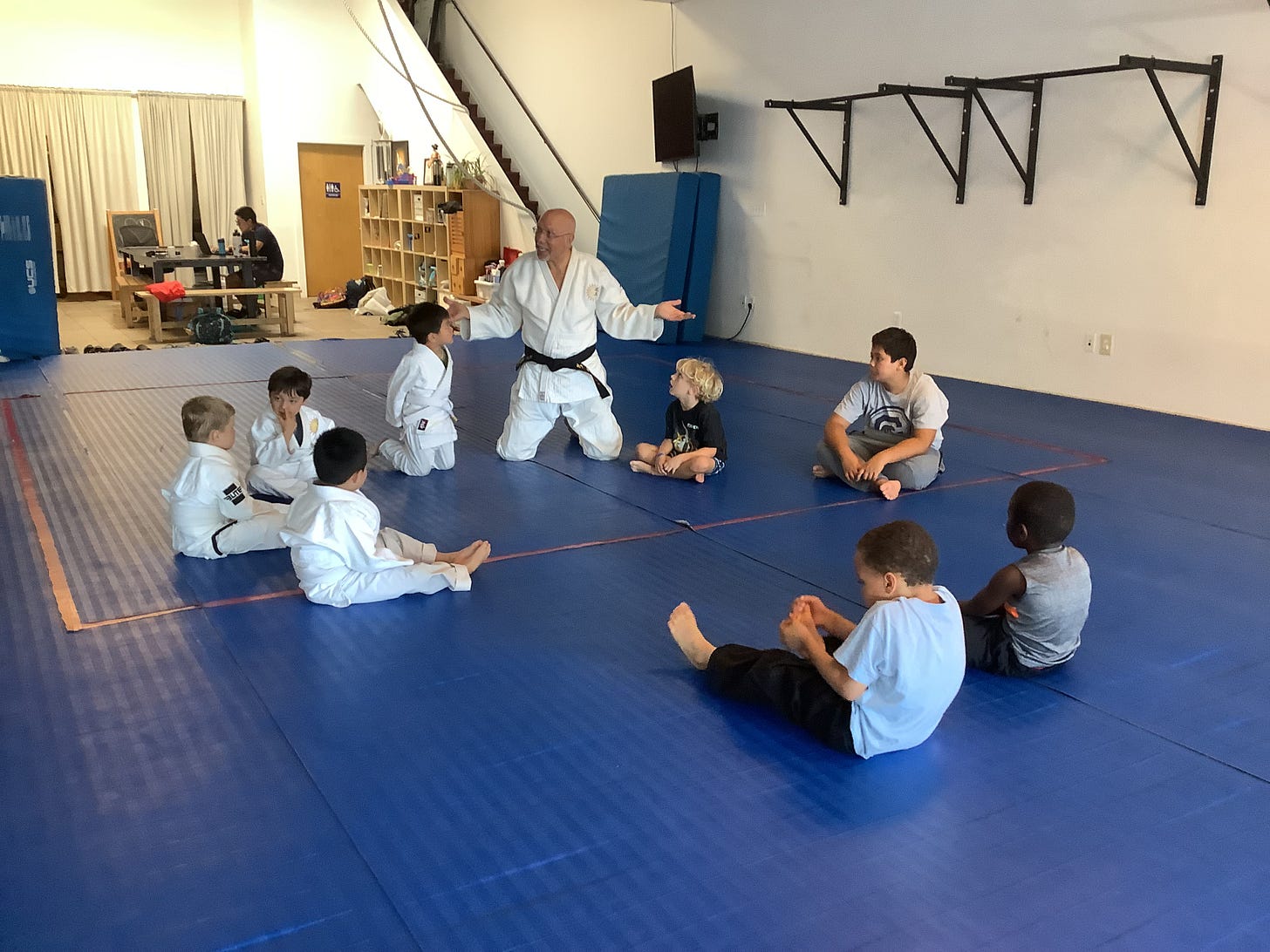 In judo, your relationship to your “sempai” (senior member) is important. The sempai helps junior members learn and benefit from their experience. Even at six years old, the older child knows they’re a sempai with responsibility to help the three-year-old. And they love helping.